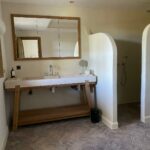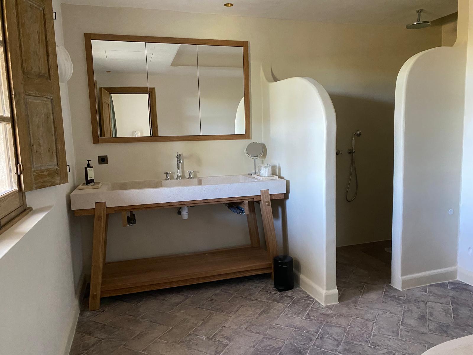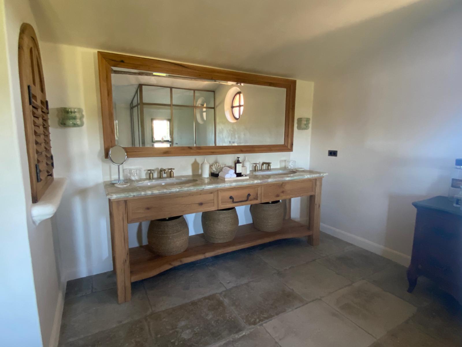 - 1 – Meubles de salle de bains en médium peint et dessus en vieux bois ponçé, chantier Bastide d’Engras (30)